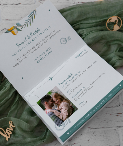 The starter package includes the passport invitation with 4 inside pages, envelopes and personalised envelope stickers. Upgrade your package to make it truly unique, by adding any of the following optional extras and building your own package to suit your budget