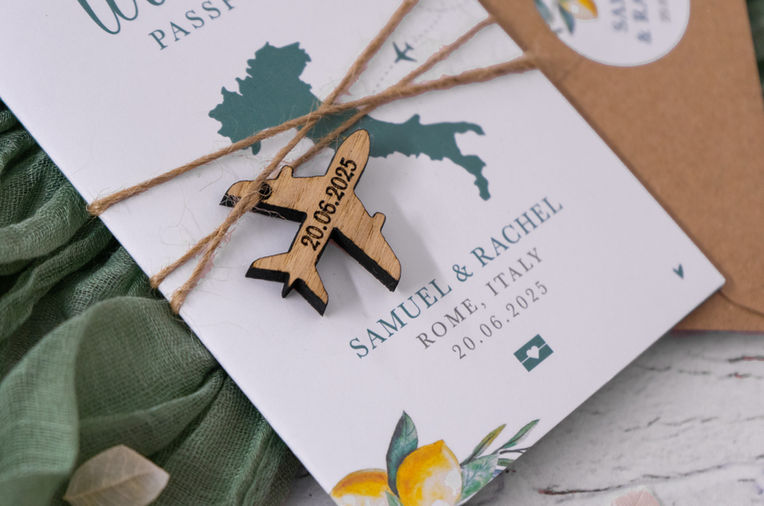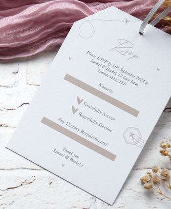Available in boarding pass shape or luggage tag shape, made to slot inside your passport invitations